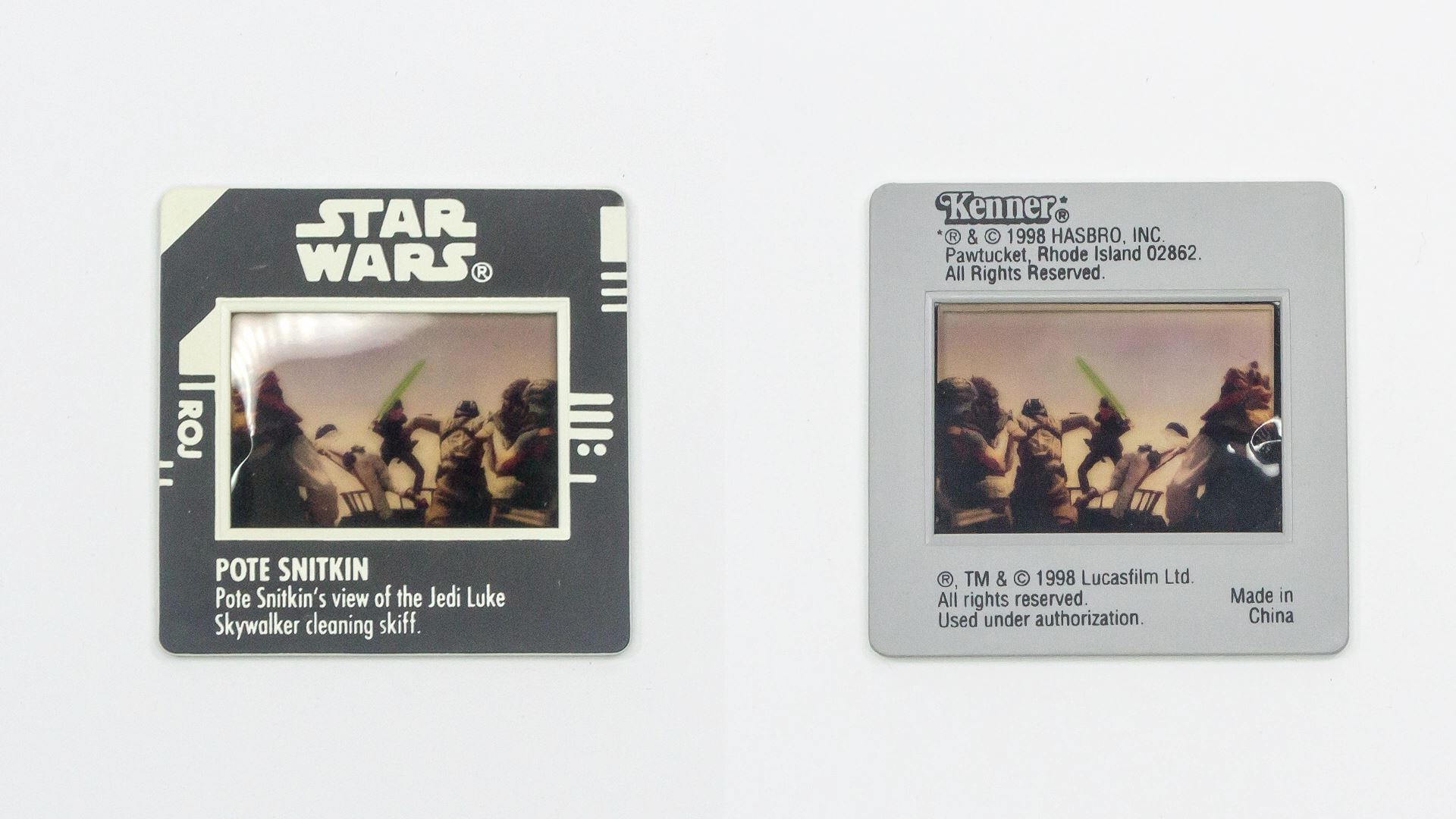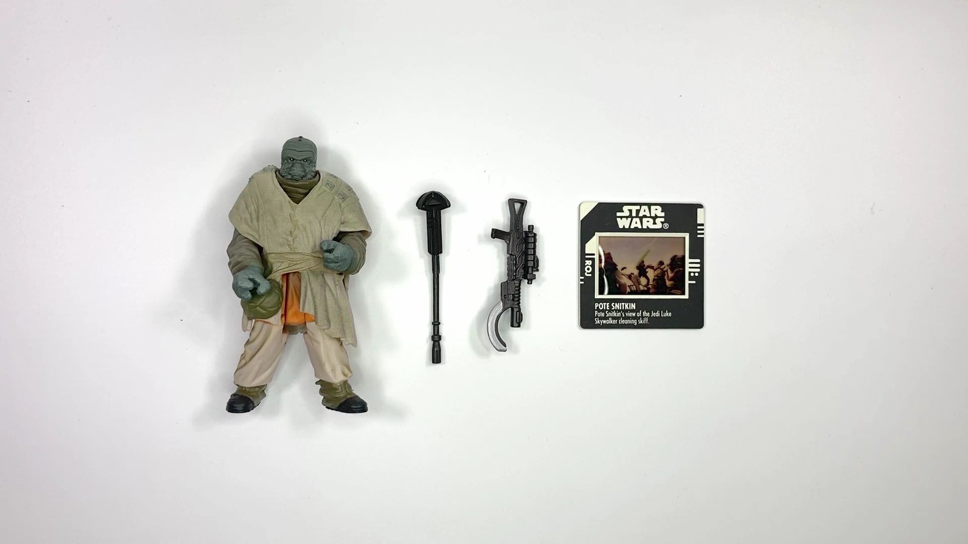 소개할 스타워즈 3.75인치 피규어는 **포테 스니트킨(Pote Snitkin)**입니다. 그는 에피소드6에서 자바 더 헛의 스키프를 조종하며 자바의 무기 딜러이자 범죄 활동에 깊이 관여한 스크릴링 종족입니다. 영화에서는 짧게 등장하지만, 삭제된 장면에서는 살락 구덩이에 떨어지는 모습도 확인할 수 있습니다. 1999년 파워 오브 더 포스 시리즈로 출시된 이 피규어는 포스 파이크, 블래스터 피스톨, 프리즈 프레임이 포함되어 있으며, 캐릭터가 등장한 영화 장면을 슬라이드 필름으로 즐길 수 있는 독특한 구성입니다. 복잡한 얼굴 조형과 세세한 옷감 표현, 여러 겹의 옷과 분리 가능한 상의까지 재현되어 영화에서 스쳐 지나간 모습을 자세히 느낄 수 있습니다. 스키프 비클과 함께 장면을 재현하고 싶은 수집가라면 반드시 갖춰야 할 피규어입니다.